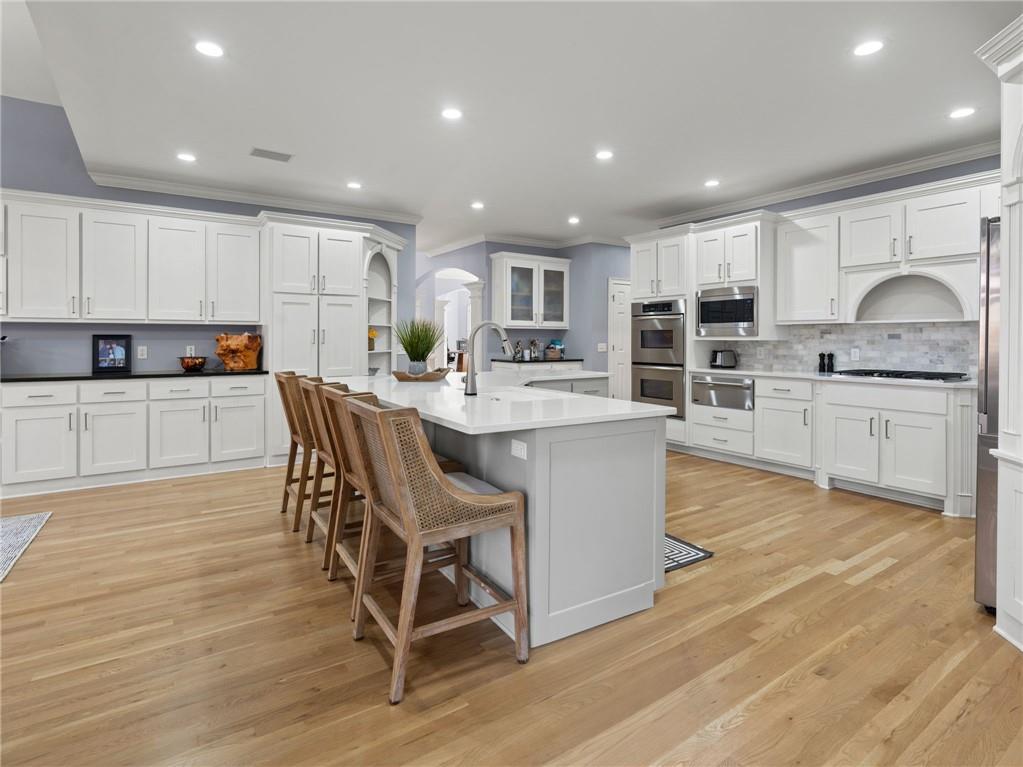 Constructed with hard-coat stucco, the exterior offers long-term durability and peace of mind. Inside, extensive renovations enhance both form and function throughout. The kitchen has been updated with a redesigned island, quartz countertops, new hardware, and updated fixtures, while main-level hardwood floors have been beautifully refinished. Upstairs, buyers will appreciate brand-new carpeting and fully renovated bathrooms, along with spacious, suite-style bedrooms featuring walk-in closets. The main-level primary suite provides everyday convenience and privacy and includes a stunning, newly renovated primary bathroom.