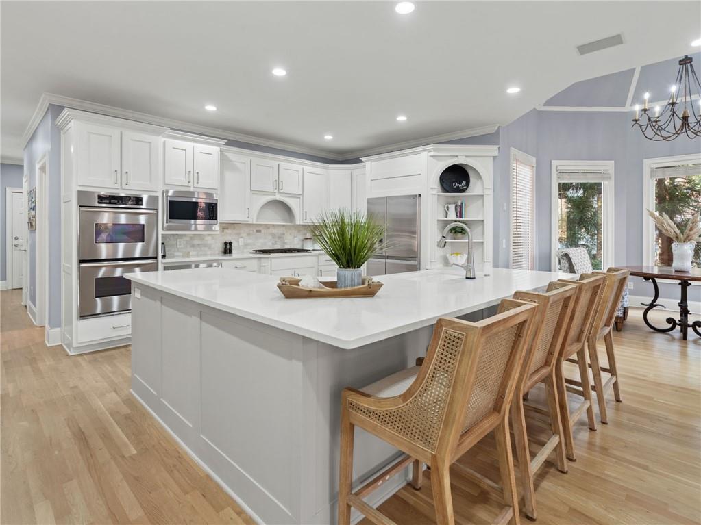 Designed for comfort and peace of mind, the home includes built-in whole-house speakers, a wired gas generator with room-specific power selection, keyless entry, and a comprehensive security system with Ring and ADT Pulse cameras. A convenient laundry chute from the upper level to the main-floor laundry room adds everyday ease.